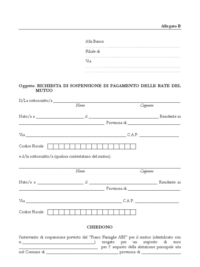 Modulo richiesta sospensione rata mutuo - Soldioggi La lettera. La richiesta di sospensione del mutuo deve essere presentata direttamente in banca. Da questo link é possibile scaricare il modello di richiesta sospensione mutuo. Per avere diritto alla sospensione, l'importo del mutuo non deve superare i 250.000 euro. Fac Simile Modello Richiesta Di Sospensione Di Pagamento ... FAC SIMILE MODELLO RICHIESTA DI SOSPENSIONE DI PAGAMENTO DELLE RATE DEL MUTUO. Scritto il 11 Luglio 2017. Pubblicato in BANCA. FAC SIMILE MODELLO RICHIESTA DI SOSPENSIONE DI PAGAMENTO DELLE RATE DEL MUTUO. u0001 che il reddito imponibile annuo di almeno uno degli intestatari non è stato superiore a 40 mila euro.