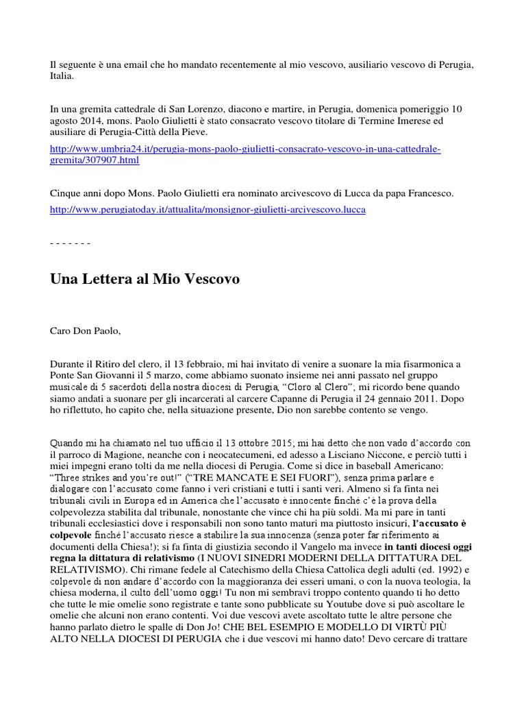 Lettera aperta ad un Vescovo - ildialogo.org Lettera aperta ad un Vescovo . A cura di Sabrina Nesti. Premessa. La presente lettera è stata partorita in una notte di tanti interrogativi, dubbi - forse - legittimi di un cristiano normalissimo, piccolo e peccatore come me, che si scontra con le scelte di una Chiesa che sembra, sempre più spesso, non rappresentare più il luogo dove un ...